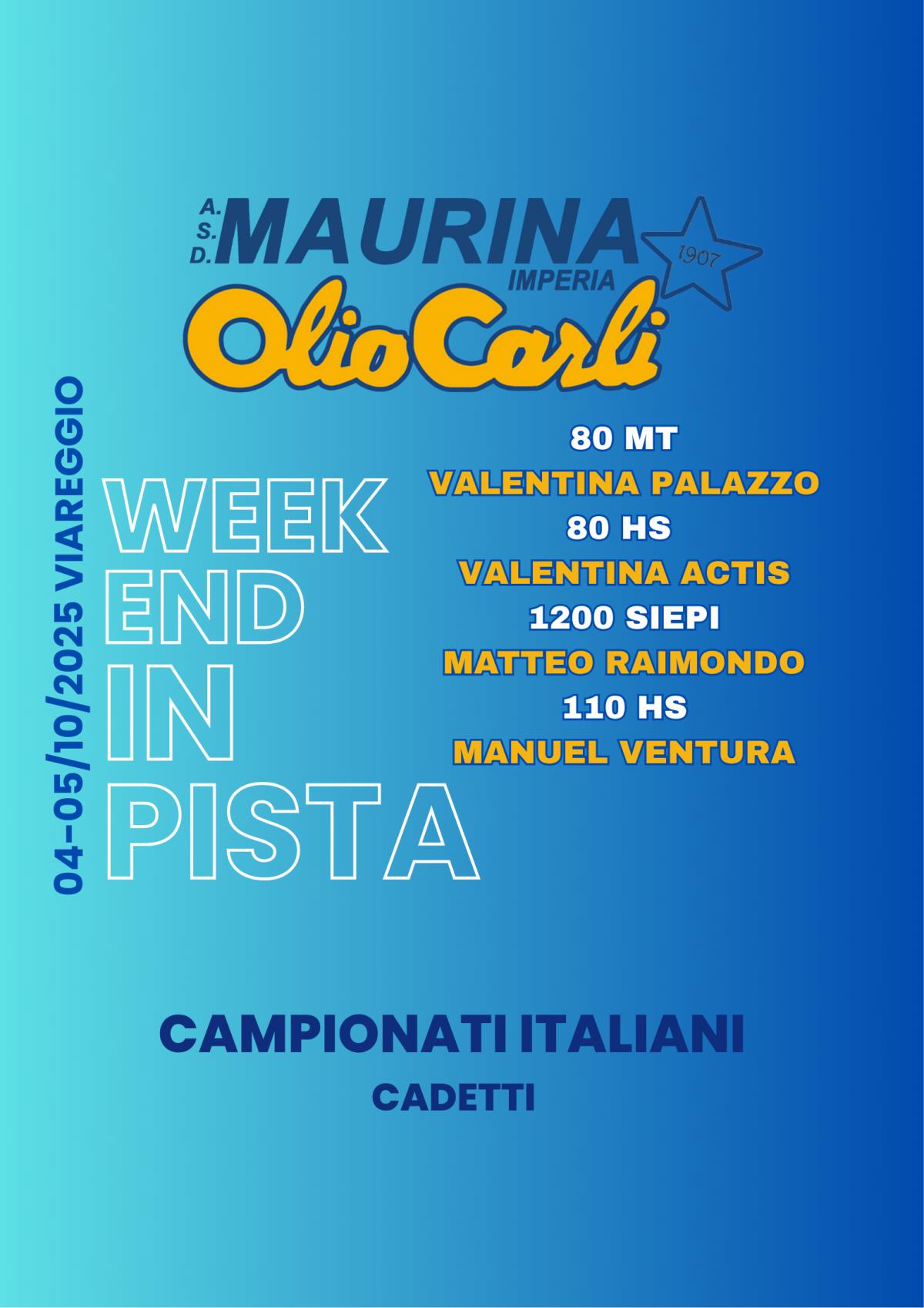 Fine settimana a Viareggio per quattro giovani atleti Maurina ai campionati cadetti: VALENTINA PALAZZO, VALENTINA ACTIS, MATTEO RAIMONDO, MANUEL VENTURA.